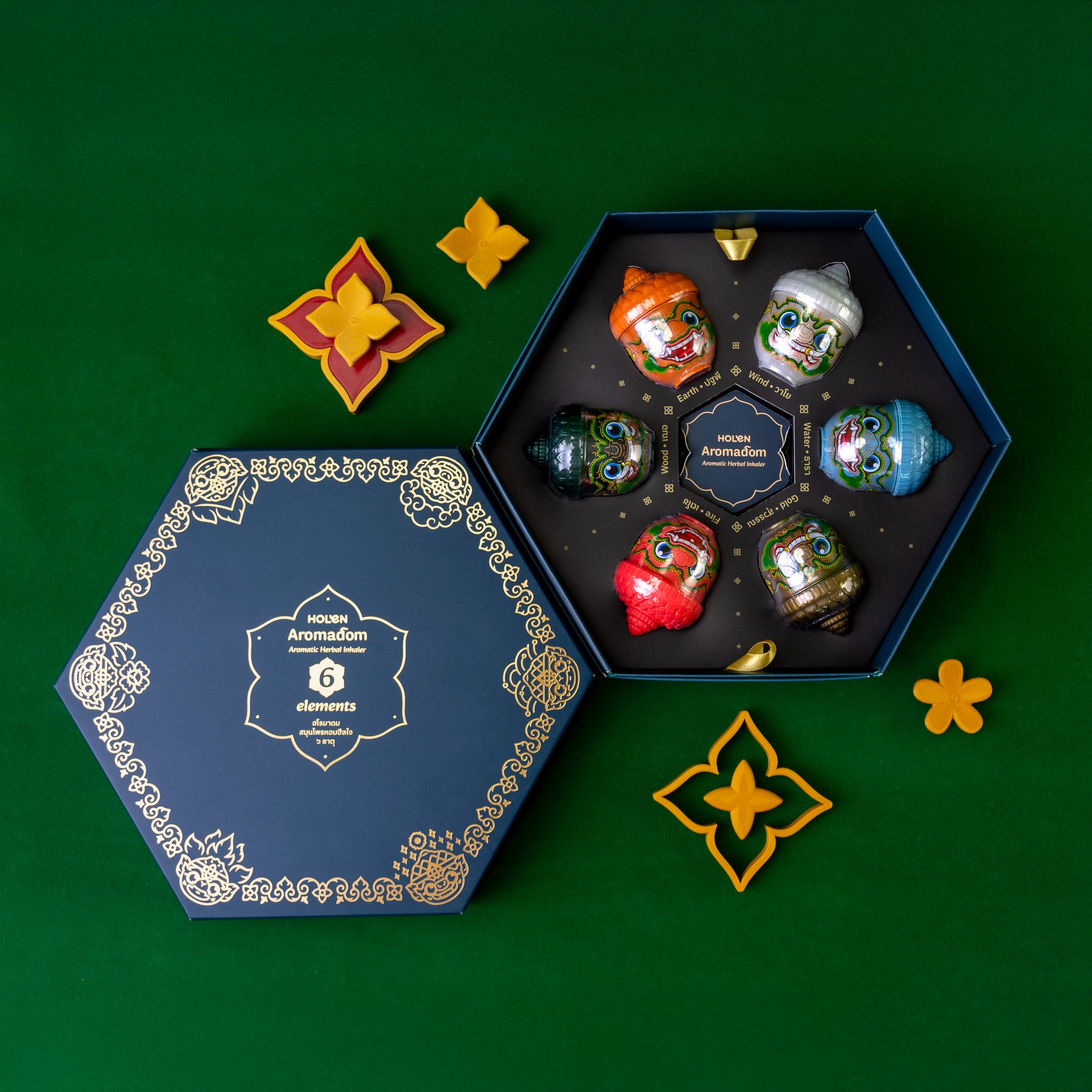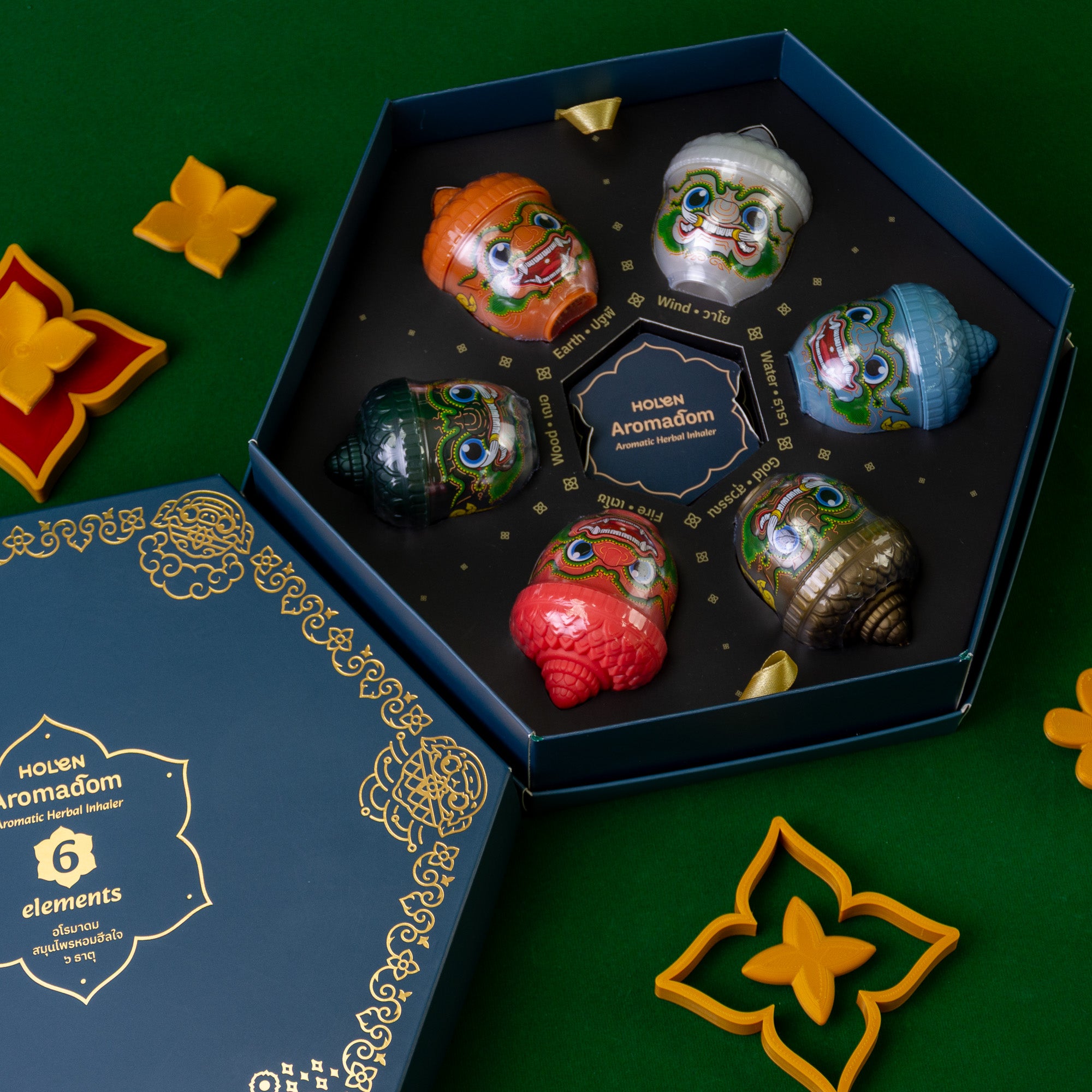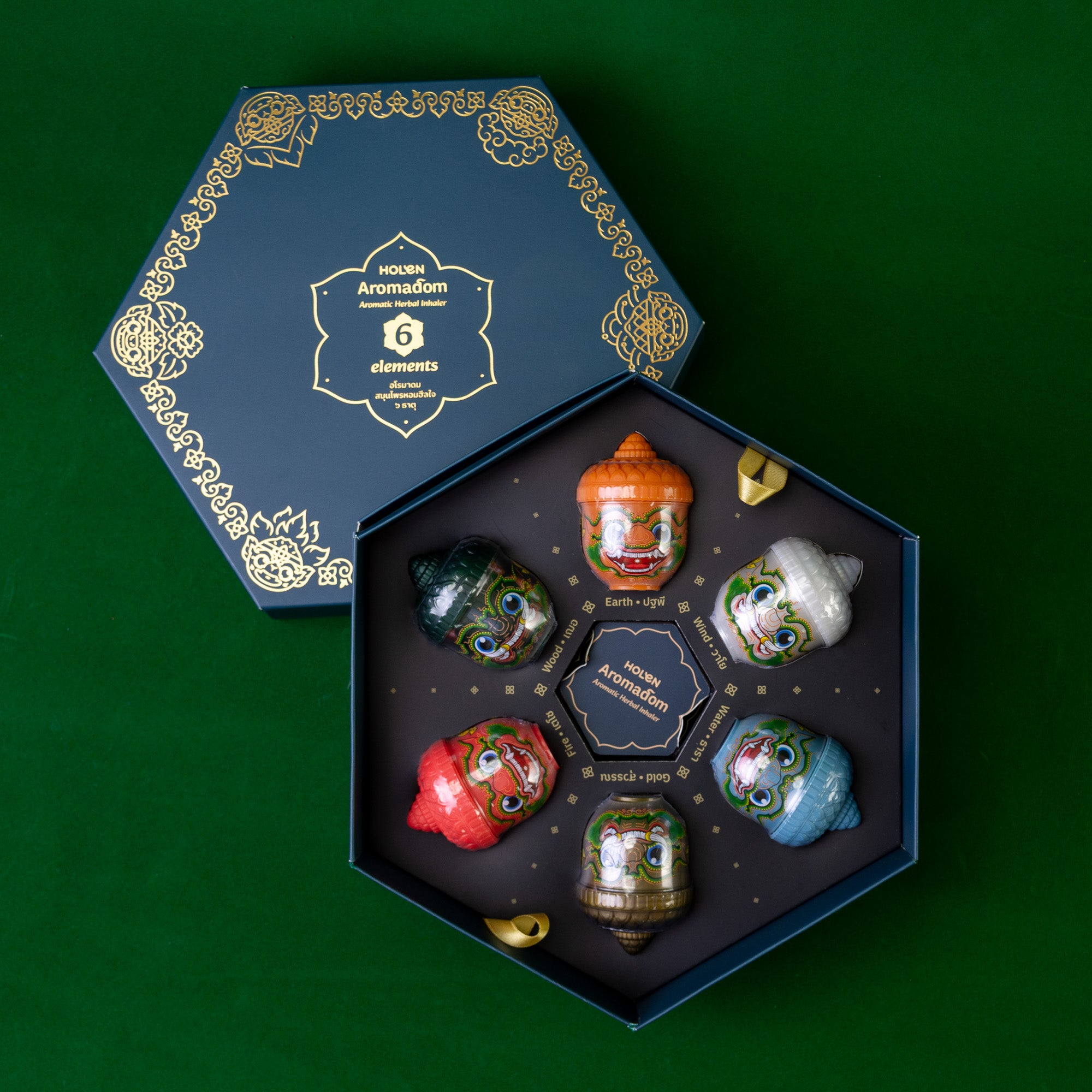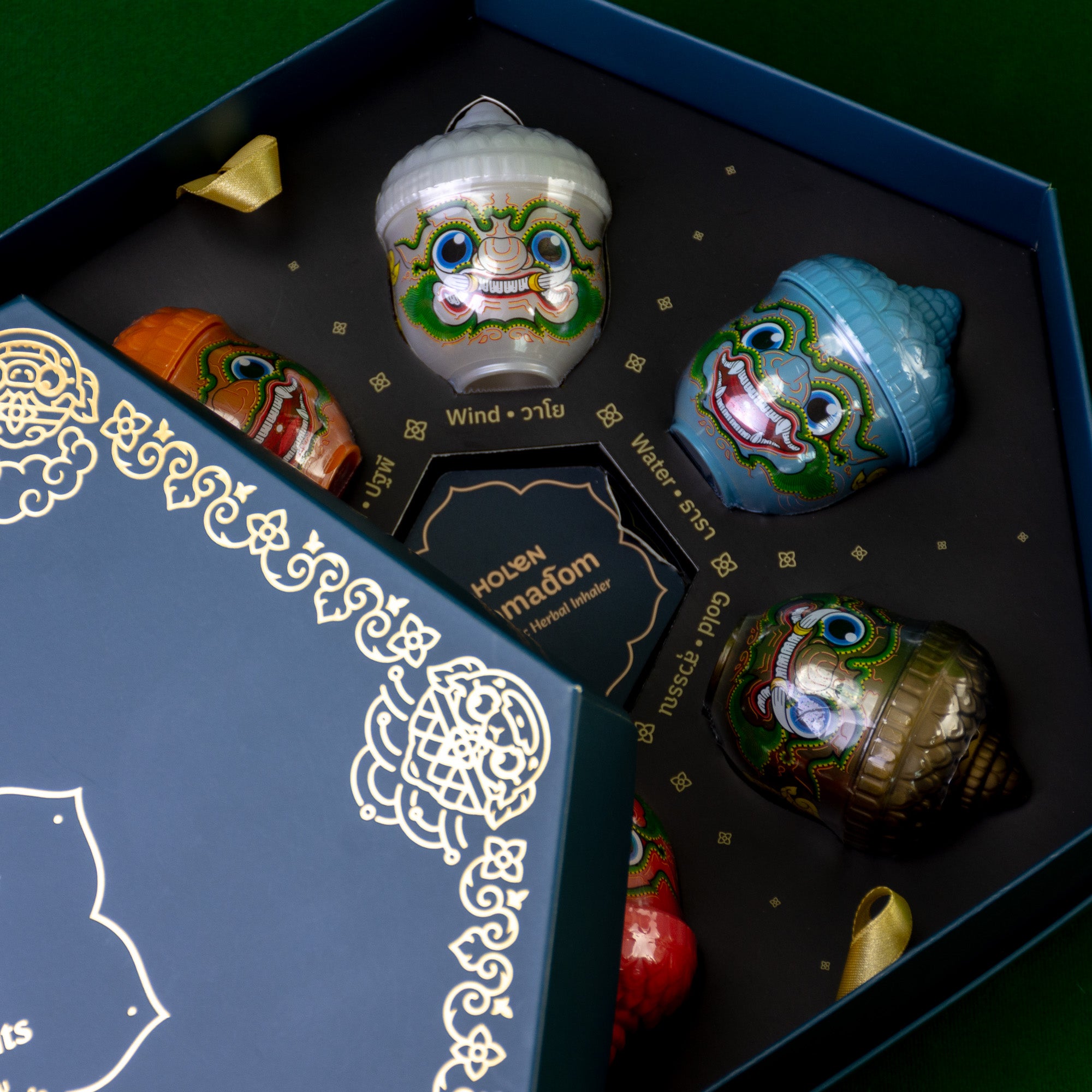 ดิน น้ำ ลม ไฟ ไม้ และทอง ⭐️ คิดค้นจากสูตรลับ ตำรับสมุนไพรไทย ปรุงกลิ่นหอมร่วมสมัย โดดเด่นด้วยดีไซน์คาแรคเตอร์ลิงยักษ์ ที่มีแรงบันดาลใจจากวรรณคดีรามเกียรติ์ บรรจุอยู่ในกล่อง Gift Set ดีไซน์สวยงาม